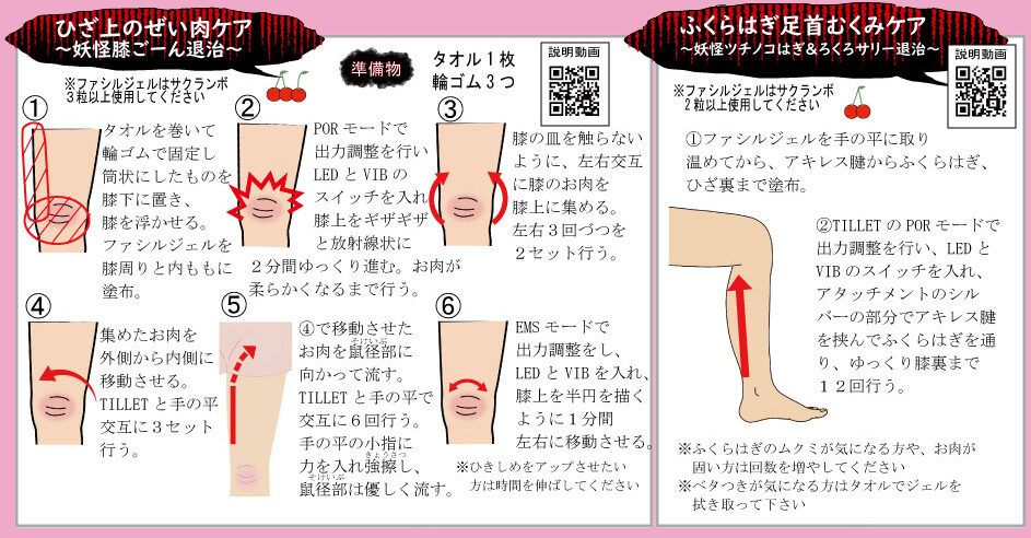 美脚ケア(上記【美脚ケア】資料を参考)に行う際の注意点として、何ヵ所も気になるむくみ個所がある場合は、必ず心臓から遠い部位から先にケアして下さい。片手に美顔器を持ち、もう片方の手のひらで交互に肌表面をしごく様に、鼠径部(そけいぶ)のリンパ節に向かって滞留している余分な水分を集めるイメージで行いましょう。リンパ節に水分を集め排泄のお手伝いをするだけなのです。片足のケアが終わったら左右を比べて下さい。ケアした脚の方が確実にすっきり細く変化しているはずです。浮腫んだり脚がだるく感じた時には上記「美脚ケア」を一度お試しください。