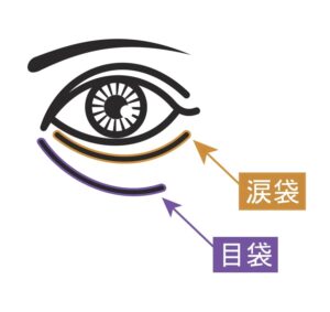 「目袋」と「涙袋」の違いを先に確認しておきましょう。(*下記イラストを参考)下眼瞼のまつ毛の際に沿うように膨らんでいるのが「涙袋」です。最近は「涙袋」を強調したメイク用品が多く発売されているようですが「涙袋」を強調する事で可愛いく笑顔の女性を印象づけます。そして今回のテーマ「目袋」は下記イラストにある様に「涙袋」の下に現れます。「涙袋」とは違い「目袋」はお顔の印象を暗く老けた様に見せます。その為気にされている方も多い事でしょう。