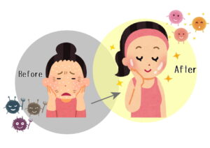以上の3アイテムの相乗効果により、60日の間に古くなった表皮の入れ替えを行い、善玉菌(表皮ブドウ球菌)が活躍しやすい肌環境へとリセットし肌本来の力を取り戻していきます。