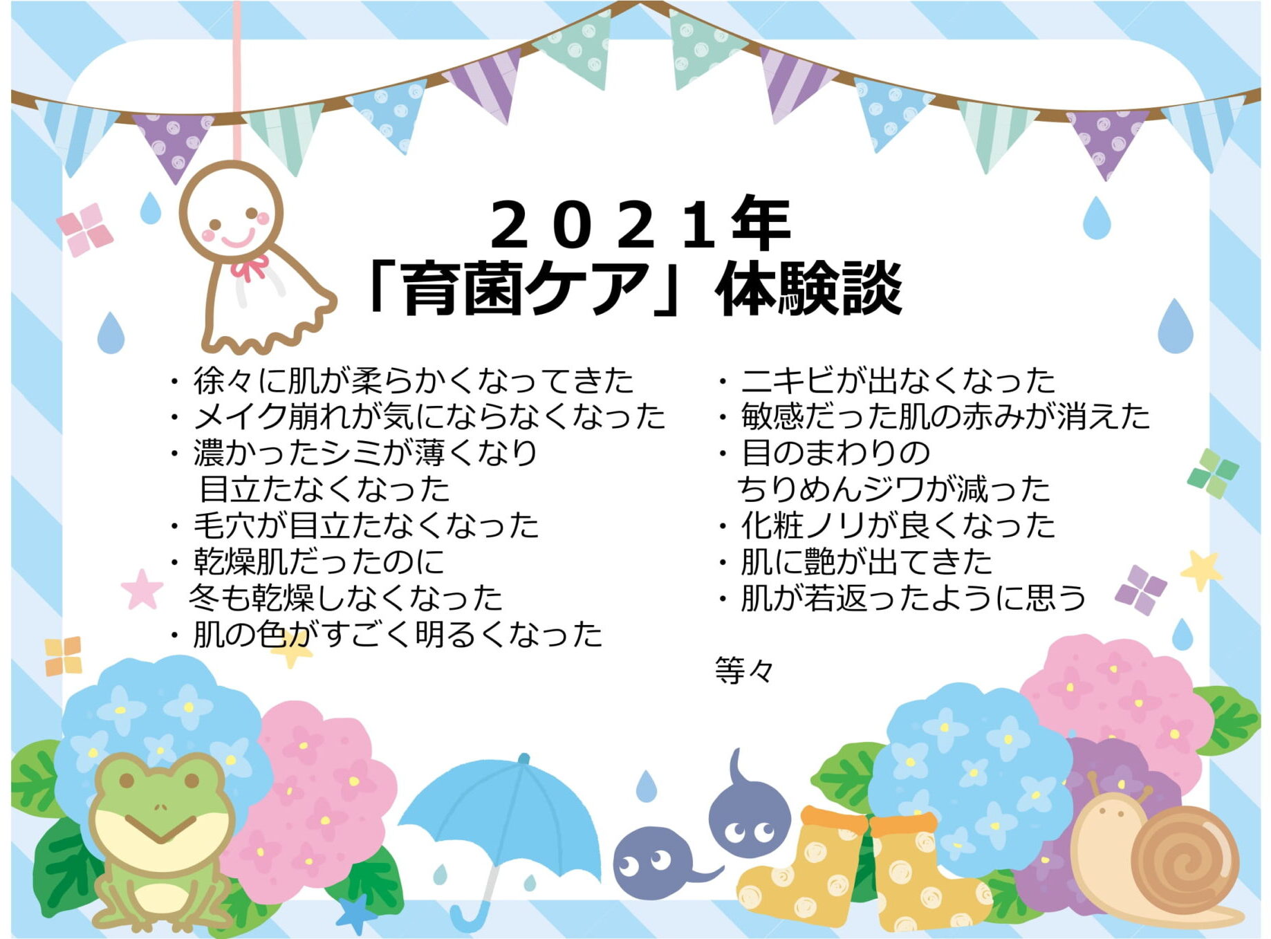 「育菌ケア」体験者の方々はシンプルな化粧品使いで肌がこんなに変わると思っていませんでした。と皆さんおっしゃいます。特に肌活力の衰えや皮脂・水分バランス能力の低下を感じる方は、是非今年の梅雨は「育菌ケア」にトライして欲しいと思います。60日後には肌力がアップし肌の変化に感動される事でしょう。最後に昨年の「育菌ケア体験者の声」を簡単ではありますがご紹介させていただきます。