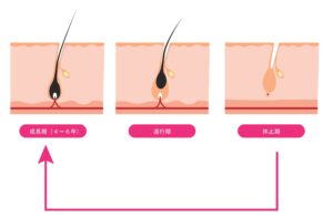 皮膚理論では、表皮のターンオーバー(新陳代謝)について皆さんもご理解されていると思いますが、肌は常に入れ替わっています。そして全身に生える「毛」も代謝を繰り返しているのです。即ち、今生えている「毛」は、一生伸び続けるわけではなく、いずれ自然に抜け落ち、同じ毛穴からまた発毛してくるのです。この周期をヘアサイクル=毛周期と呼んでいます。