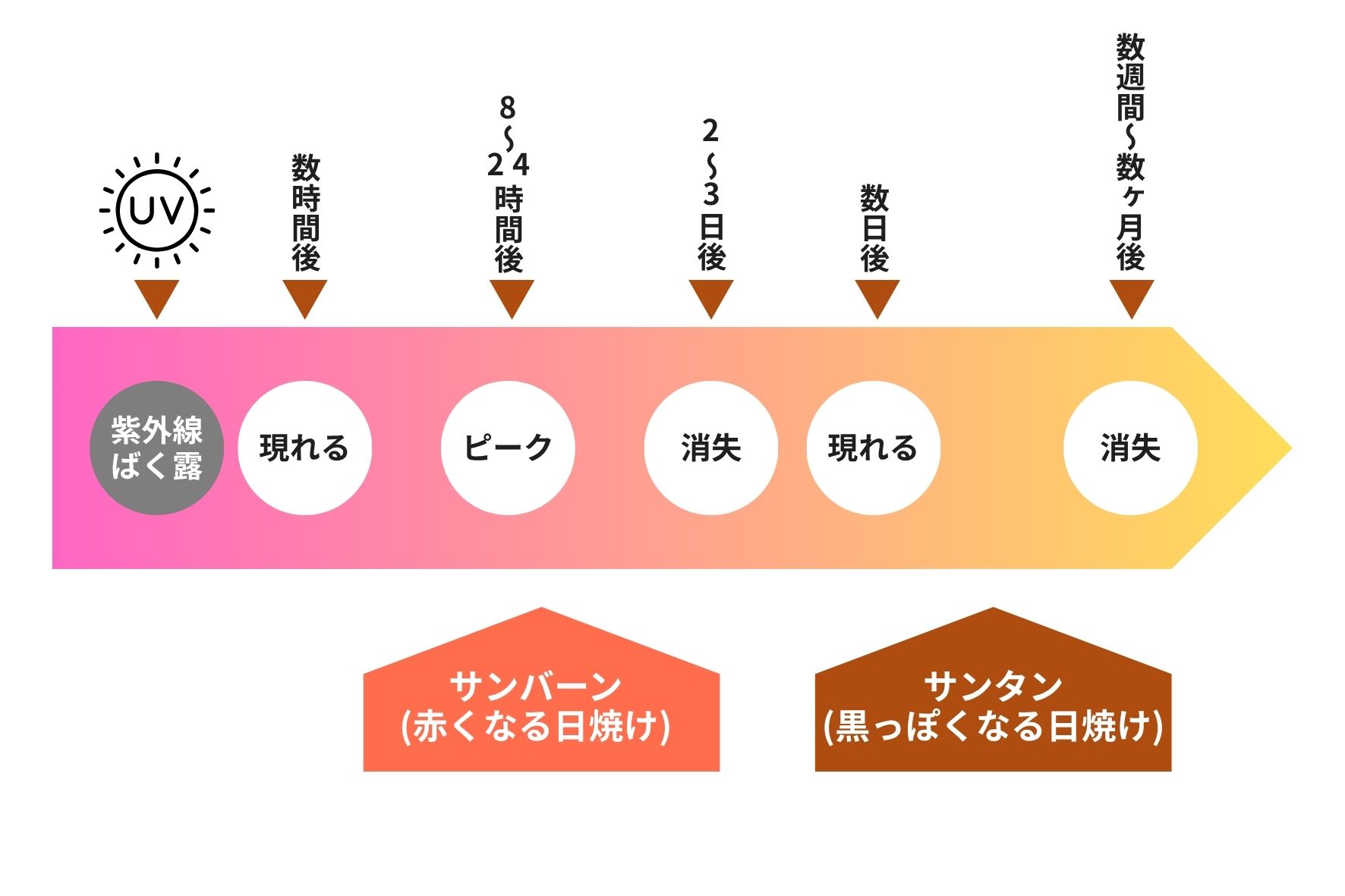サンバーンが消失すると数日間でサンタン(黒くなる日焼け)が現れ数週間から数ヶ月間で消失します。肌が黒くなるのは肌が持つ防衛反応でメラニンを多く生産する事で細胞を紫外線から守ろうとするのです。通常ならターンオーバーによって肌はほぼ以前と同じ色に戻りますが、紫外線の影響を受けたサンバーンとサンタンの時々に間違ったスキンケアを行うと肌の老化を加速させてしまうので要注意です。