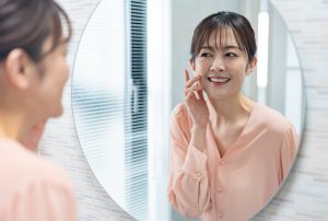 ところで法令線が現れる原因はもう一つあります。それは、日々の「姿勢」です。特に頭の位置がポイントです。現代病とも言われるストレートネック(またはスマホ首)の人は、要注意です。既にストレートネックだった人がコロナ禍の3年でスマホやパソコン画面に向かう時間が今まで以上に増えてしまい、20代でも法令線を気にする女性が多くなっているのです。猫背・反り腰の方も注意してください。特に首をゆっくり大きく回すとジリジリ・ガリガリと違和感のある音のする人は頸椎に無理がかかっているのかもしれません。そんな方は是非入浴時中に首を温め、右回り左回りとゆっくり頭を回したり、顔を左向き右向きに動かすなど、首回りの筋肉をほぐすだけでもリンパの流れも良くなり上記の表情筋トレーニング効果もアップします。