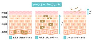 1.ターンオーバーの促進・・・角層の厚みを均等にし、再生リズムを整える事で新陳代謝を促します。