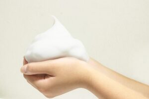 ポイント1.洗顔料はしっかり泡立ててから顔に乗せ下から上に円を描く様に進み強く擦らず、長時間行わない事!(洗顔料にもよりますが、泡洗いは1分以内に済ませましょう)