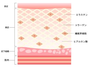 真皮層には、血管やリンパ管・神経などが多く存在しており、それを守るかのように繊維成分のコラーゲンやエラスチンが存在しています。紫外線や加齢により線維芽細胞が機能低下し、新たに繊維成分やヒアルロン酸を生成できなくなることで、皮膚が薄くなり弾力を失いタルミが生じてきます。