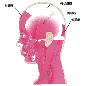 下記の図にもある様に頭頂部は頭蓋骨を覆うように帽状筋膜があり、それを支えるように前頭筋・側頭筋・後頭筋が存在します。